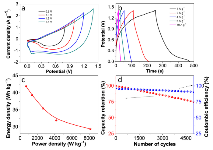 The electrochemical performance of the RGO/PPy/NiCo-LDH electrode was further accessed by fabricating an asymmetric supercapacitor (ASC). RGO/PPy/NiCo-LDH and RGO were used as the positive and negative electrodes, respectively. The loading masses of RGO/PPy/NiCo-LDH and RGO were 9 and 45.8 mg, respectively. Fig. 10(a) shows the CV curves of the RGO/PPy/NiCo-LDH//RGO asymmetric cell at various potential windows (0.8-1.4 V). No severe polarization was observed up to 1.4 V. Therefore; this value was selected for performance analysis of the developed ASC. Fig. 10(b) shows the rate performance of the ASC. The specific capacitance of the ASC is 154 F g-1 at 1 A g-1, and it retains 71 % its capacitance (108 F g-1) when current density increases to 10 A g-1.