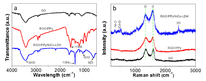 FT-IR spectra (a) and Raman spectra (b) of GO, RGO/PPy, and RGO/PPy/NiCo-LDH.
