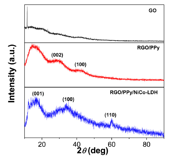 Fig. 4 shows the XRD patterns of the GO, RGO-PPy and RGO/PPy/NiCo-LDH. A peak located at 11.5° in the pattern of GO indicates the presence of a few layers of GO [29]. Two diffraction peaks at around 28° and 43° observed in the GO and RGO-PPy correspond to the (002) and (100) lattice in amorphous carbon structure [33]. The peaks in the XRD pattern of RGO/PPy/NiCo-LDH at 18.3°, 32.6° and 59.6° can be indexed as (001), (100) and (110) planes of hexagonal NiCo-LDH (PDF, #74-1057) [34], which is idential to the SEAD results.