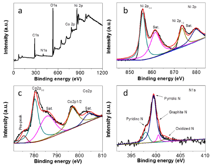 XPS survey spectrum of RGO/PPy/NiCo-LDH (a), high-resolution XPS of Ni 2p (b), Co 2p (c), and N 1s (d).