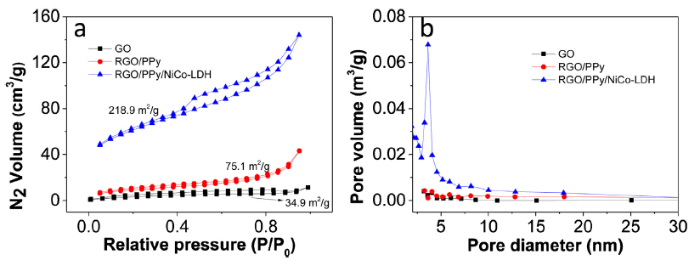 N2 adsorption-desorption isotherms (a) and pore-size distribution curves (b) of GO, RGO/PPy, and RGO/PPy/NiCo-LDH.