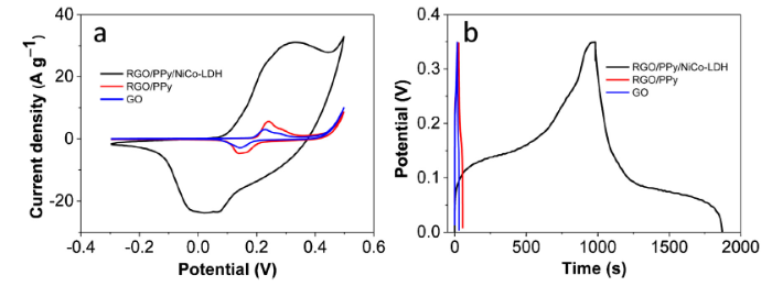 Electrochemical characterization of GO, RGO/PPy, and RGO/PPy/ NiCo-LDH electrodes: (a) CV curves at 10 mV s-1; (b) GCD curves at 1 A g-1.