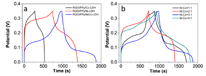 (a) GCD curves of RGO/PPy/Co-LDH, RGO/PPy/Ni-LDH, and RGO/PPy/ NiCo-LDH at 1 A g-1 and (b) GCD curves of RGO/PPy/NiCo-LDH with various Ni/Co ratios at 1 A g-1.