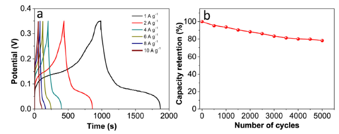 Fig. 9(a) shows GCD curves of the RGO/PPy/NiCo-LDH electrode at different current densities. The specific capacitances of the electrode are 2534, 2411, 2278, 2084, 1928 and 1837 F g-1 at current densities of 1, 2, 4, 6, 8 and 10 A g-1, respectively. When the current density increased to 10 A g-1, the electrode can retain 72.5 % of the initial specific capacitance. The high surface area, short ion diffusion path, and high electrical conductivity of the electrodes are mainly responsible for this superior electrochemical performance.