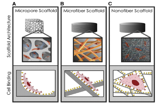 Schematic of how a scaffold structure affects cell adhesion and spreading [32]. (A), (B) Cells adhere in a flat morphology on the microporous and microfiber scaffolds, similar to that observed on flat surfaces. (C) Nanofibers have a greater surface area, and therefore adsorbed more protein, providing more adhesion sites for cell membrane receptors.