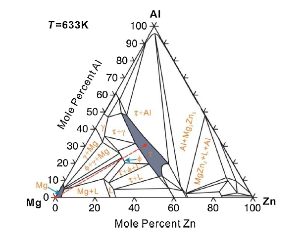 In order to study the diffusion growth behavior of ternary ϕ phase, a diffusion bilayer with Mg and τ phase as two end-members was designed. Fig. 1 gives the computed isothermal section of Mg-Al-Zn at 633 K (360 °C) according to the previous thermodynamic description of Mg-Al-Zn system using Thermo-Calc software [14,30]. The composition of two end-members of the diffusion couples are denoted as red dots, i.e. Mg and τ phase, while the red dashed line is the hypothetical diffusion path that goes across ϕ phase.