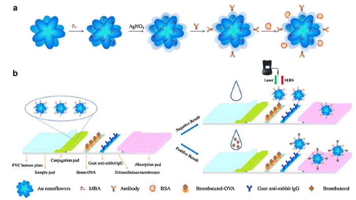 a) The illustration of preparation process of flower-like gold nanoparticles. b) The structure of the SERS-LFIA strip and the principle of competitive detecting format. (Reprinted with permission from [108] Copyright Springer-Verlag Wien 2017).