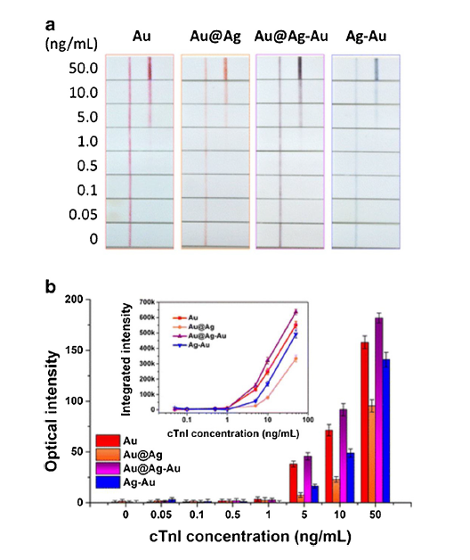 Another enhancing method is to use core/shell structures on the surface of SERS-active NPs. Blanco-Covián et al. [109] designed Au@Ag nanoparticles as SERS labels in the LFIA for the detection of penumolysin. Jia et al. [110] presented an attractive model based on core/shell structure where the Au@Ag NPs were dual-dyed with DTNB. They demonstrated that this SERS tag was of high bioconjugation flexibility, and the assay achieved to detect IgM with a limit down to 0.1 ng/mL, two orders of magnitude higher than the sensitivity of colorimetric LFIAs. Furthermore, Bai et al. [111] developed a SERS-LFIA system based on four kinds of nanoparticles synthesized by Au/Ag. By comparing the performance of each nanoparticles, they concluded that nanoparticles in Au@Ag-Au structure had the highest SERS activity as shown in Fig. 11, and the system could realize a detection limit of cTnI of 0.09 ng/mL, 50 times lower than visual results.
