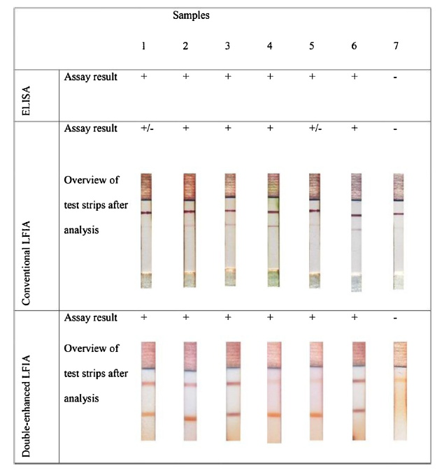 The ELISA results of potato leaf extracts. A comparison between double-enhanced LFIA and the conventional LFIA. (Reprinted with permission from [131] Copyright 2018 Elsevier).