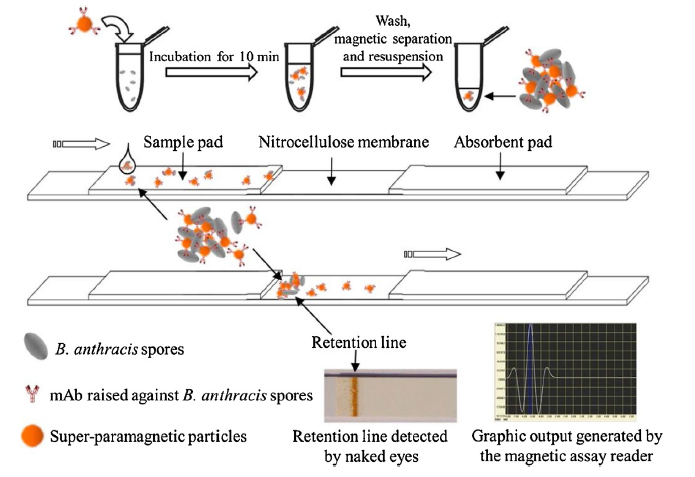 The biggest problem in MLFIAs is excessive magnetic enrichment. Once the MNPs are agglomerated on the conjugated pad, the liquid flow channel is blocked, which will greatly increase the detection time and influence the antigen-antibody combination. The use of super-paramagnetic NPs as labels is a promising solution to this problem. Super-paramagnetic nanoparticles refer to a kind of magnetic ions whose hysteresis loops feature no remanence and coercive force. Compared with general MNPs, super-paramagnetic NPs have unique advantages of greater specific surface area and lack of hysteresis. The former enables the super-paramagnetic NPs to link more functional groups for biomolecule combinations, and the latter ensures the disappearance of magnetic enrichment during handling and storage. Wang et al. [132] studied the effect of the types of super-paramagnetic nanoparticles on detection signals in detail. They designed a series of nanoparticles with different sizes and magnetite contents as labels in MLFIAs. Four types of MNPs (MNP133, MNP111, MNP204 and MNP300) are used for the measurement of hCG, and the magnetic signal intensities are displayed on the MAR. The result indicated that the size of super-paramagnetic nanoparticles decided the detection time, and the magnetite content determined the signal intensities. Wang et al. [133] proposed another lateral-flow immunological system for the detection of Bacillus anthracis spores. To analyze the detection result, an MAR was used for reading the magnetic signals. To make the test more intuitive and easier to operate, a three-in-one detection method was developed by this group [134] two years later. The novel system can realize optical, magnetic and naked-eye detection of Bacillus anthracis spores in only one test. This detection is on the basis of “Road Closure” principle (shown in Fig. 14), where the conjugates of B. anthracis spores and antibody-decorated MNPs will block the holes in the strip. Instead of forming the test lines on the strip like a traditional LFIA, a retention line is displayed in this experiment near the sample pad. As a result, high sensitivity and specificity detection of B. anthracis spores is achieved with easy operation and low cost.