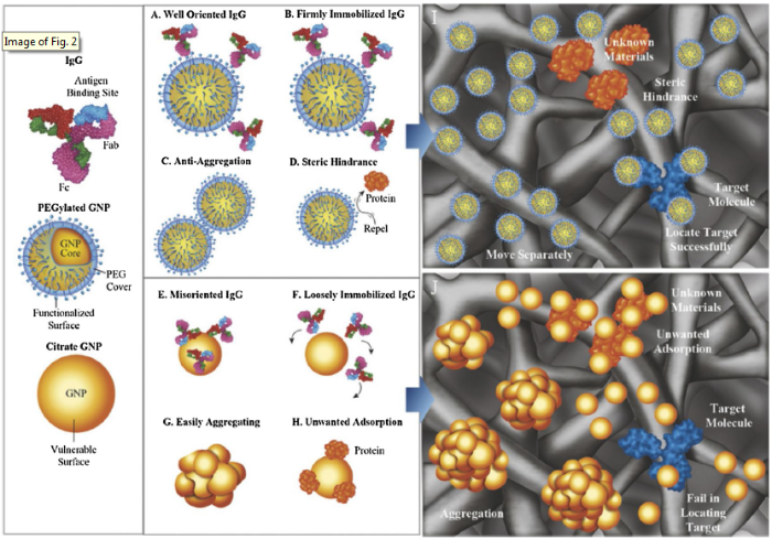 ... Comparison between the PEG-modified AuNPs and regular citrate AuNPs in binding mechanism. (Reprinted with permission from [31]. Copyright 2017 WILEY-VCH Verlag GmbH & Co. KGaA, Weinheim).