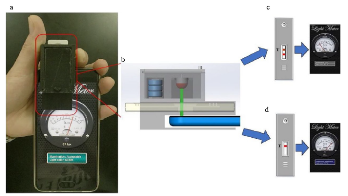 To make CG-LFIAs more portable, several researchers have developed smartphone-based system for on-site detection. Yu et al. [35] detected alkaline phosphatase (ALP) in milk samples based on a smartphone camera. Hou et al. [36] developed a dual-modality imaging system for the quantification of hCG and carcinoembryonic antigen (CEA). The system could not only detect colorimetric signals of AuNPs, but also read florescent signals of quantum dots. As a result, a good detection linearity was obtained in both labels, and the assay proved to be ideal in POCT diagnoses due to its high sensitivity and portability. Furthermore, Xiao et al. [37] reported a smartphone’s ambient light sensor (SPALS) in CG-LFIAs for detecting cadmium ions (Cd2+), clenbuterol and porcine epidemic diarrhea virus (PEDV). In their work, the SPALS recorded the transmitted light signals from the test strips and calculated the intensities which were finally displayed on the smartphone (shown in Fig. 3). The test result was ideal, and this approach was outstanding in easy operation and low in cost.