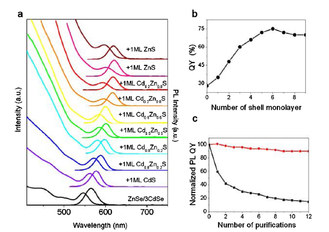 (a) Evolution of the absorption photoluminescent spectra upon consecutive change of CdxZn1 - xS. (b) Evolution of the quantum yields upon number of shell monolayer. (c) Evolution of the photoluminescent quantum yields upon repeated precipitation of ZnSe/3CdSe (black squares) and ZnSe/3CdSe/CdxZn1 - xS/ZnS (red dots) core/shell QDs. (Reprinted with permission from [58] Copyright 2011 IOP).