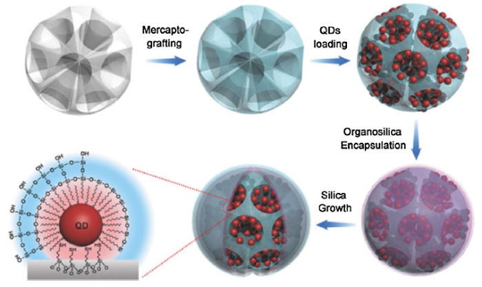 Principles of the formation process of pitaya-type silica spheres embedded with QDs. (Reprinted with permission from [62] Copyright 2017 WILEY-VCH Verlag GmbH & Co. KGaA, Weinheim).