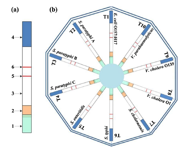 Furthermore, UCP-labels have great potential in multiplex detection [[84], [85], [86], [87], [88]]. Zhang et al. [86] realized rapid quantification of three pathogens in one test (Bacillus anthracis, Brucella spp., and Y. pestis). The assay showed high specificity and excellent stability in a wide range of pH conditions, which was ideal for POCT in the application of first-level emergency response. Additionally, Zhao et al. [87] developed a ten-channel UCP-LFIA to simultaneously detect foodborne pathogens (shown in Fig. 8). They integrated ten strips into a disc to make the system more portable and less consuming. As a result, 10 kinds of foodborne pathogens were quantified in a wide range of concentrations within 20 minutes. Recently, Zou et al. [88] studied a sensitive LFIA system by labelling broad-specific monoclonal antibodies with UCPs. The assay could achieve multiplex detection of three organophosphorus (OP) pesticides with a linear range from 0.98 to 250 ng/mL, which is expected to be a great screening tool in POCT for food samples.